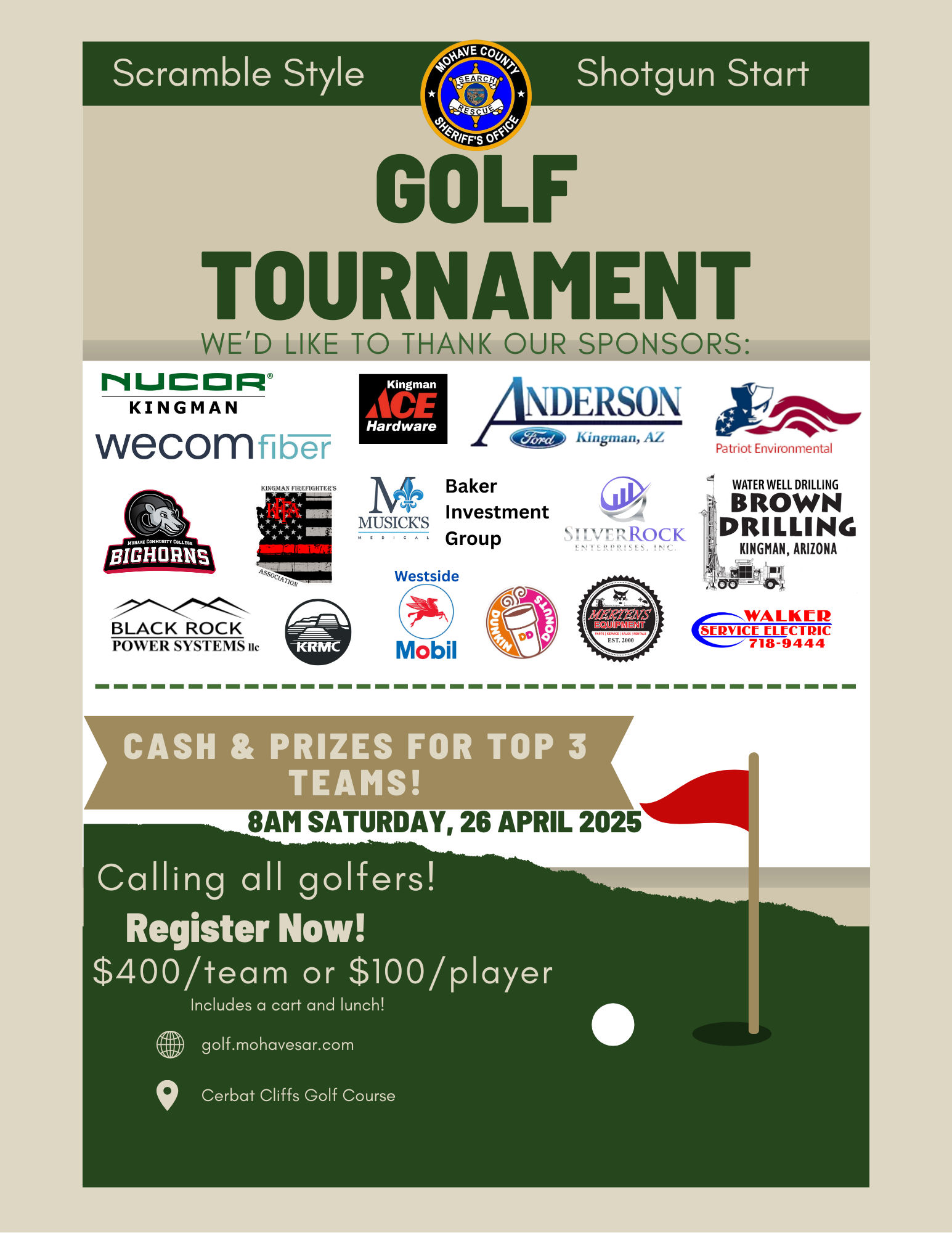 The Kingman Unit of the Mohave County Sheriff's Office Search and Rescue is having their Annual Golf Tournament April 26th, 2025 at the Cerbat Cliffs Golf Course.